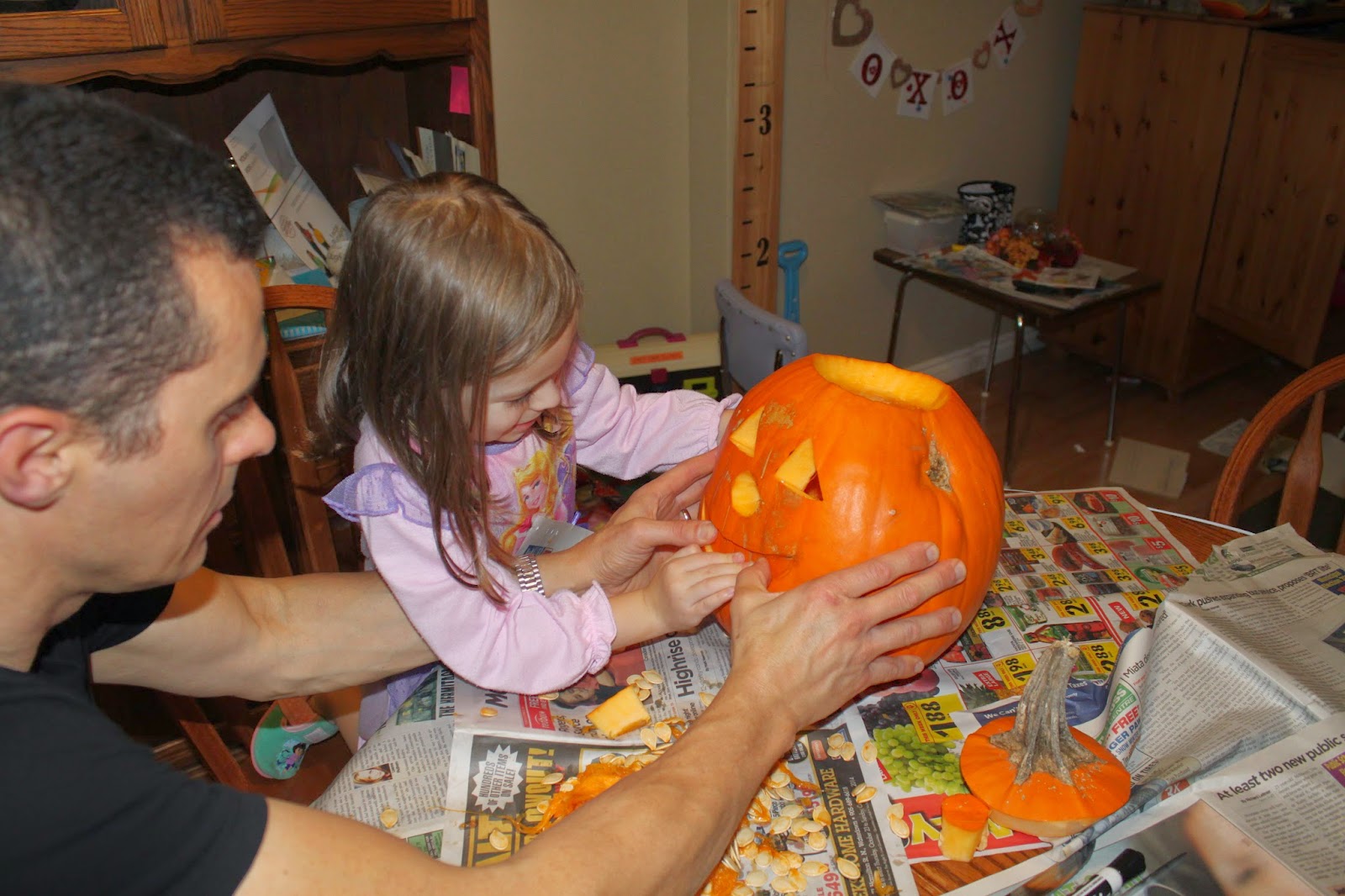 I had fears that she would want an elaborate Disney Princess based design. Her request? A happy face. She chose the shape of the eyes, nose and mouth and we got to carving. She helped to poke out the pieces.